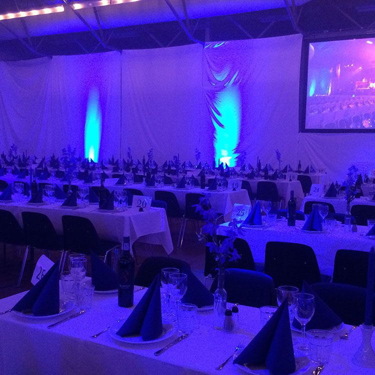 I hallerne i Vingsted Hotel & Konferencecenter fik vi til opgave at skabe en smuk ramme, der skulle transformere sportshallerne til fest i logofarven blå.