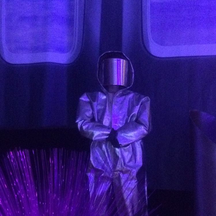 En del af atmosfæren blev skabt gennem en video, som vi klippede sammen af afsendelsen af en rumfærge. I loftet hang store oppustelige stjerner. UFO’er med programmeret lys var ligeledes en del af dekorationen.