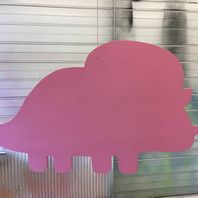 Da spillet inkluderede dinosaurer, udarbejdede vi dinoerne fra spillet i 2D-udgaver hjemme på værkstedet. De dinoer, som børnene kunne se hænge i loftet, var altså magen til dem, som var med i spillet.